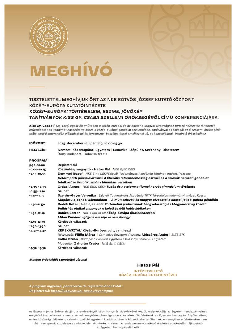 A Közép-Európa Kutatóintézet december 12-re konferenciát szervez Kiss Gy. Csaba (1945-2025) emlékére. A rendezvényre a Ludovika Főépületének Széchenyi Dísztermében kerül sor 10-15.30 között.